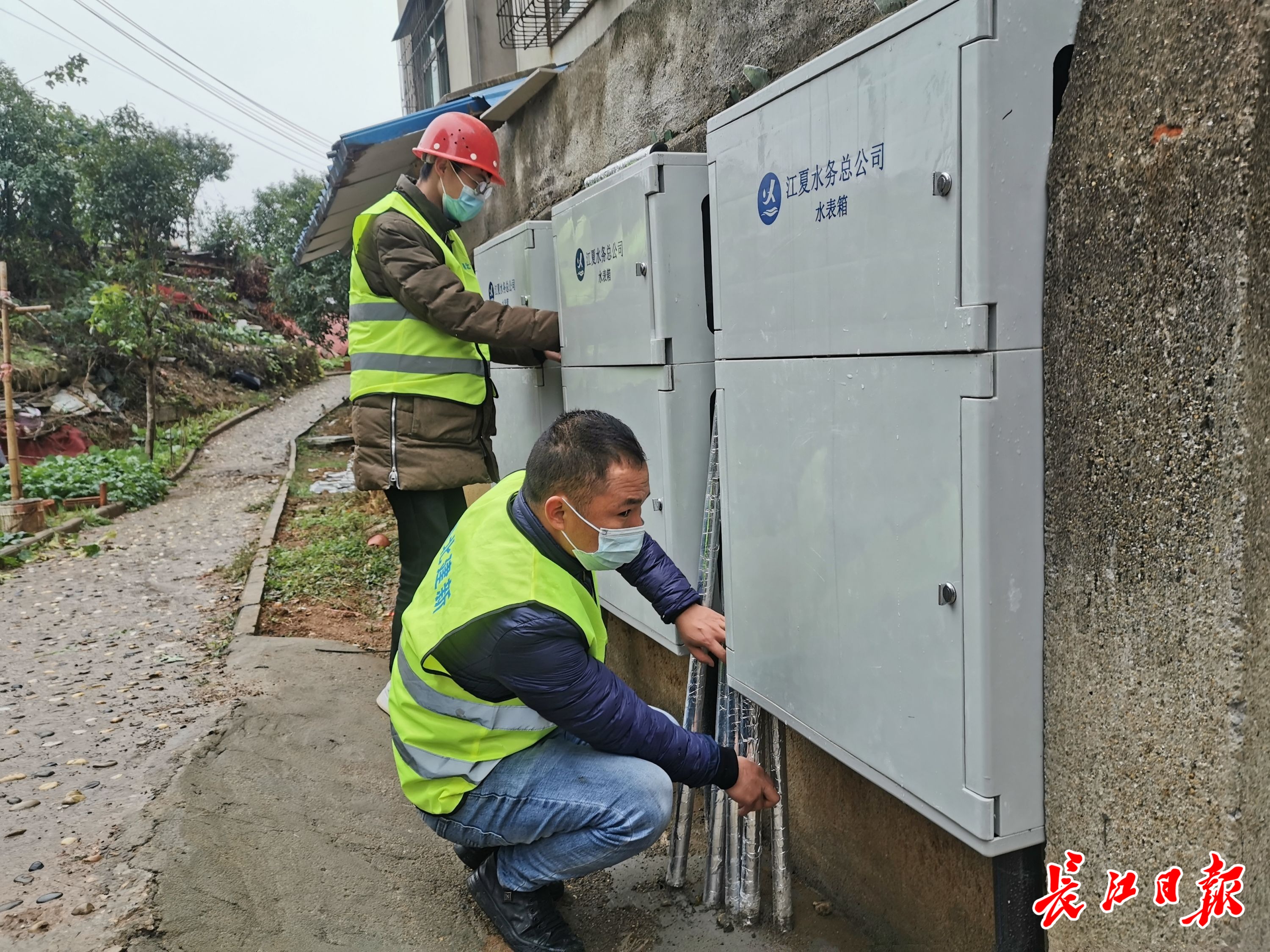 林场小区和林特小区位于纸坊街道东边、青龙山脚下,记者看到,这里的居民小区沿坡而建、地势较高,房屋老旧、布局密集。施工现场,因天气寒冷,江夏区水务总公司组织人员对暴露在户外的水管用保暖棉进行包扎。只见新安装的水表挂上了墙,集纳进金属箱内,施工工人正在楼房之间更换水表。