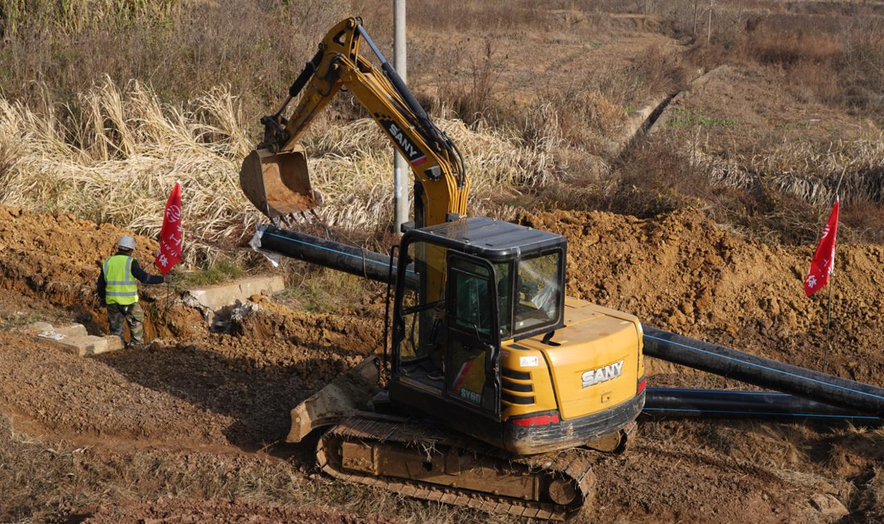 12月13日,记者在新洲区道观河水厂管网延伸工程(徐古街、潘塘街)项目施工现场看到,工人们正用挖掘机进行管道沟槽开挖、管道铺设安装、土方回填等工作,施工现场紧张有序。