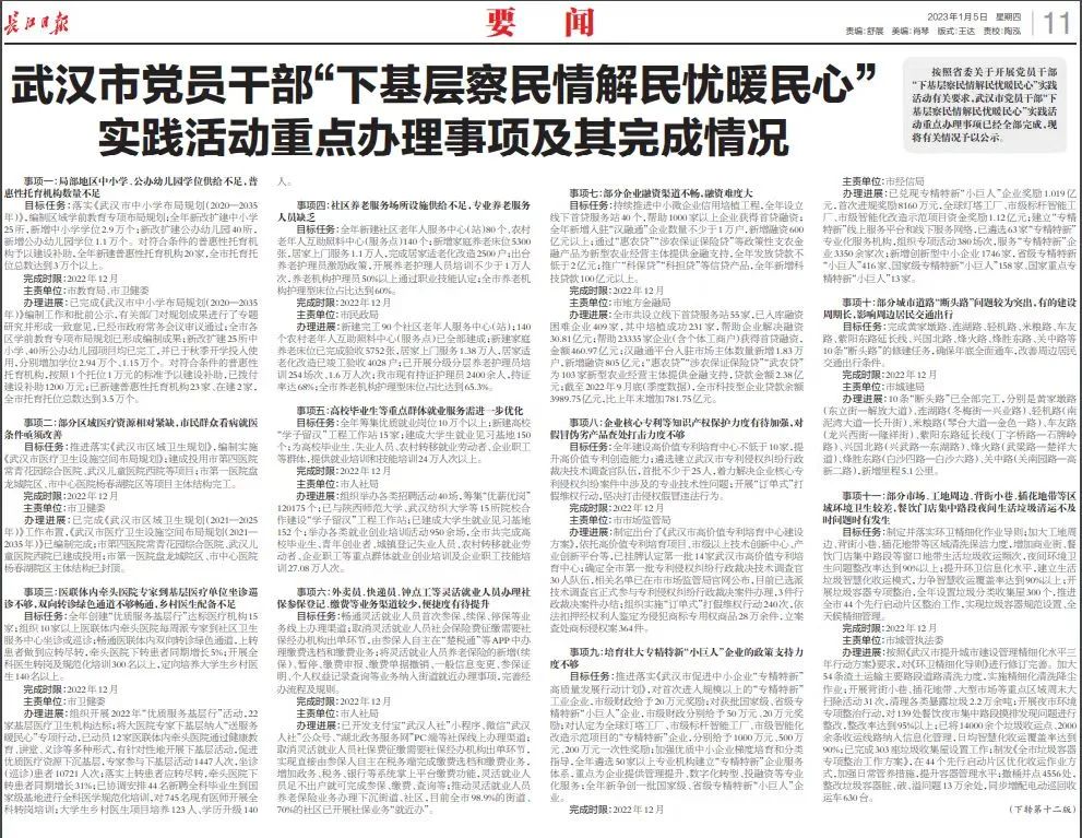 2022年,武汉市政府工作报告中公布了市政府民生实事事项清单,改善居住条件、完善便民服务设施、改善出行条件、老旧小区二次供水改造等20项民生实事位列其中。