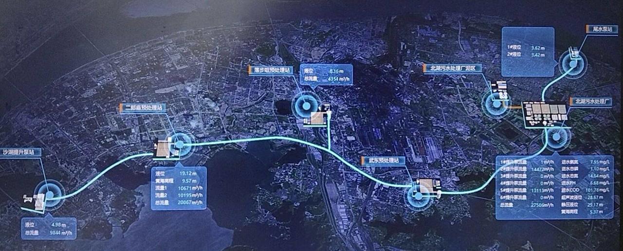 北湖污水处理厂项目是国家“长江大保护”和武汉“四水共治”治污水大布局中的关键工程,由武汉市水务集团旗下上市公司武汉三镇实业控股股份有限公司筹资建设,中铁上海局、中国一冶等企业具体承建其土建工程。项目建成投产后,服务面积约130平方公里,服务人口达248万人。作为国内一次性建成规模最大的污水处理工程在项目建设和管理过程中,北湖污水处理厂项目工地积极运用BIM、物联网、智能设备,多位一体打造“智慧工地”平台,实现了从传统工地向数字化、智慧化方向转变的跨越式发展。大东湖核心区污水传输系统示意图,武昌沙湖至青山北湖沿线130平方公里服务范围内的所有污水通过一条深度25—42米、长17公里的深隧,也就是大东湖核心区污水传输系统,传输至北湖污水处理厂处理厂深隧泵房。