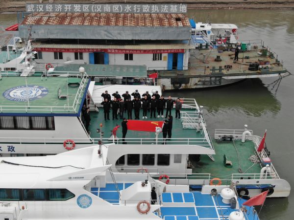 2月10日上午,7艘执法艇和75名执法人员在武汉经开区水政执法码头集结,联合开展主题党日活动。通讯员供图