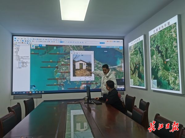 “我们沿湖泊岸线布下高空监控摄像头,与工作站智慧平台对接,实现了湖泊、水库岸线全天候、全方位、无死角监控。”3月1日一早,在龙泉街河湖长制工作站智慧平台、显示大屏前,工作人员李博开始工作。他不断调取监控实时画面,巡视异常情况,并核对测量数据。只见他在实时高空俯览地图上沿房屋外缘轻点鼠标,拉出测量范围,大屏立即显示房屋周长、面积。“我们与此前无人机采集的初始数据进行比对,发现房屋变大‘变胖’,就要立即实地核实,防止违建行为。”