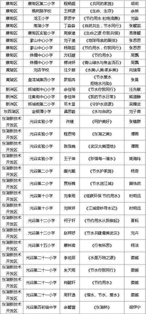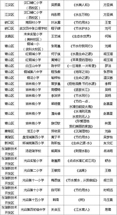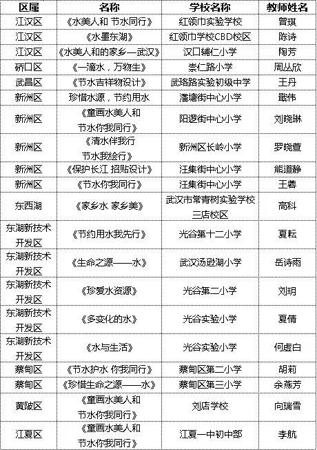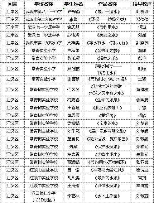 此次活动得到全市广大师生积极响应和参与。经学校推荐、区级选拔、市级评审,江岸区育才可立小学余铭洋《节约用水》等30件节水主题绘画作品荣获一等奖,武汉市第八十一中学严梓菡《最后一滴水》等50件作品荣获二等奖,长春街小学郭乂萌《保护环境,保护水资源》等80件作品荣获三等奖;江汉区红领巾实验学校曾琪《水美人和节水同行》等20件教案荣获节约用水主题教育优秀教案。
