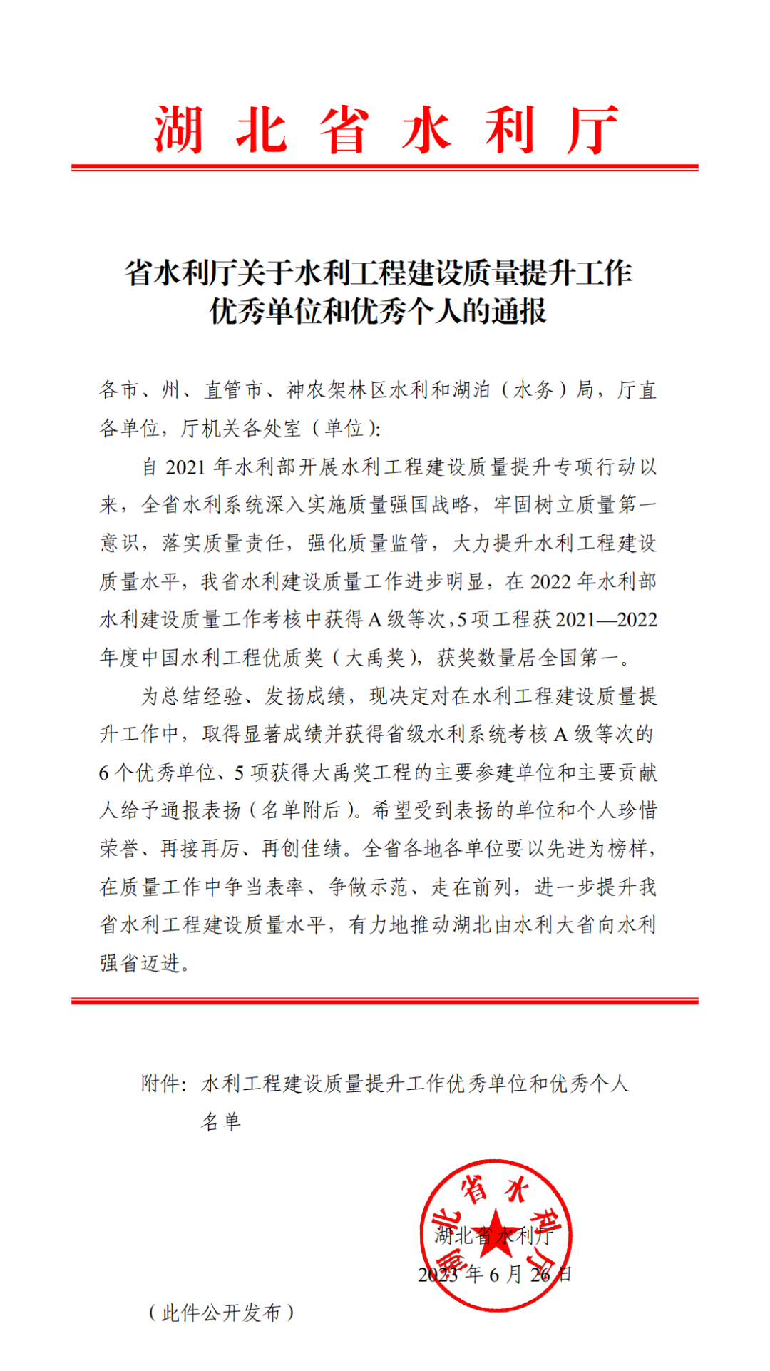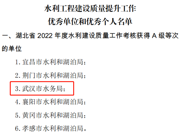 近日,湖北省水利厅通报,武汉市水务局在2022年水利部水利建设质量工作中获得A级等次,被评为水利建设质量工作优秀单位。