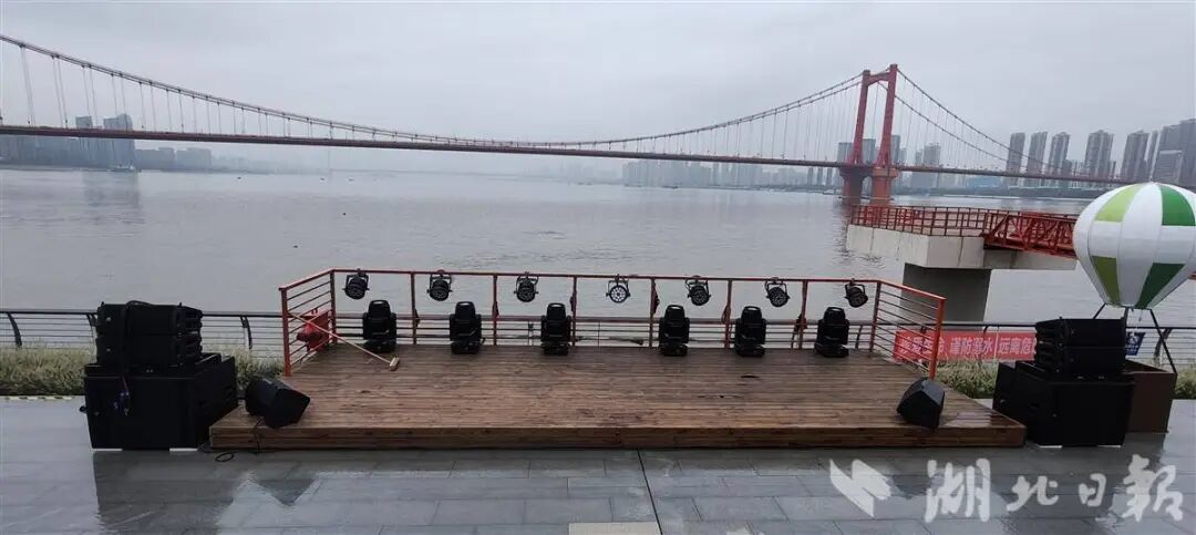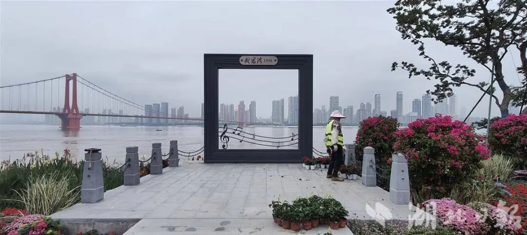 相隔不远,江边立起的一处巨大的相框便是第二个打卡点,上面有“武昌湾1956”字样和流动的音符造型。在此拍照,橘红色的鹦鹉洲大桥、林立的城市高楼和宽阔的江面成为背景,十分壮观。