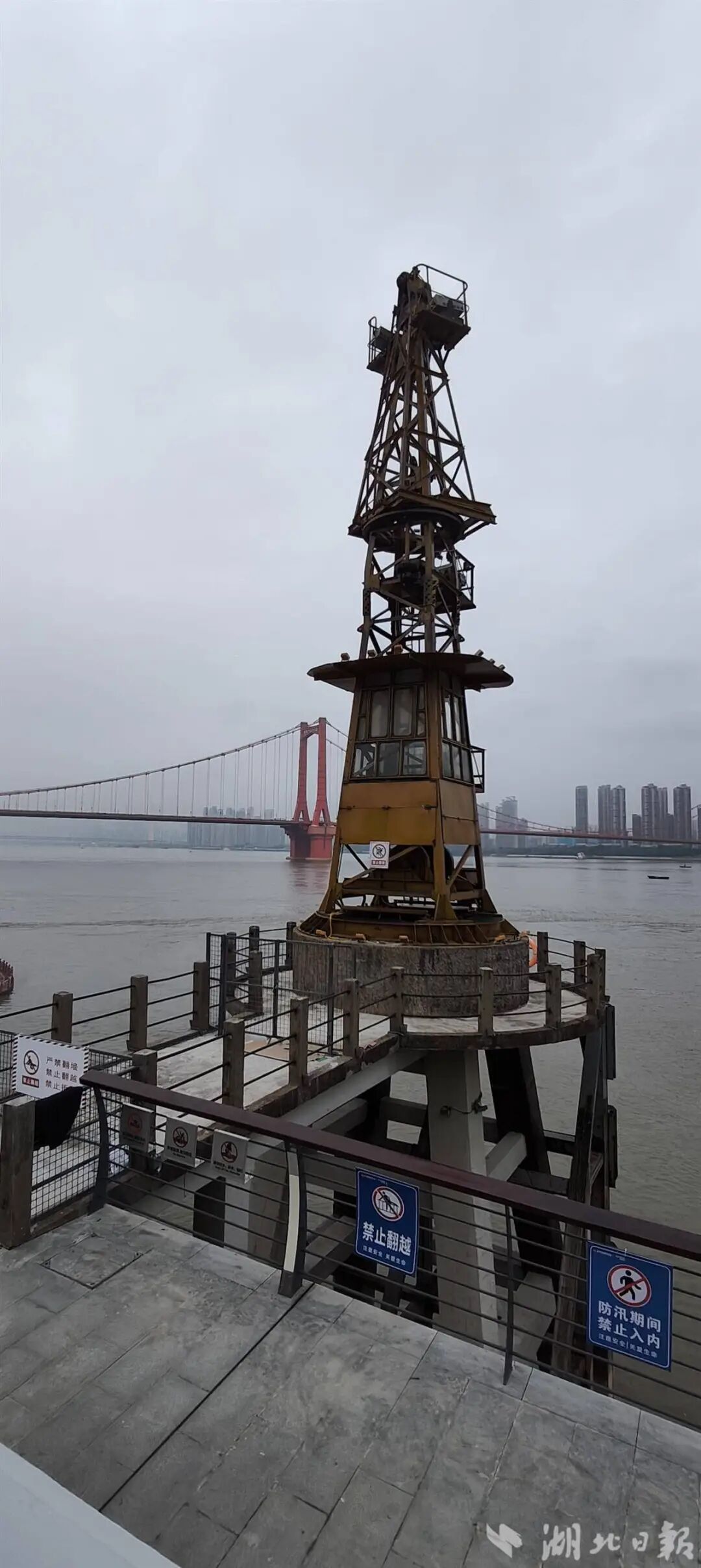 继续溯江而上,第三处打卡点则是一座历史塔吊。这是1958年9月13日毛泽东主席畅游长江时,武船职工热烈欢迎的历史见证,经过精心修缮,还原历史原貌。