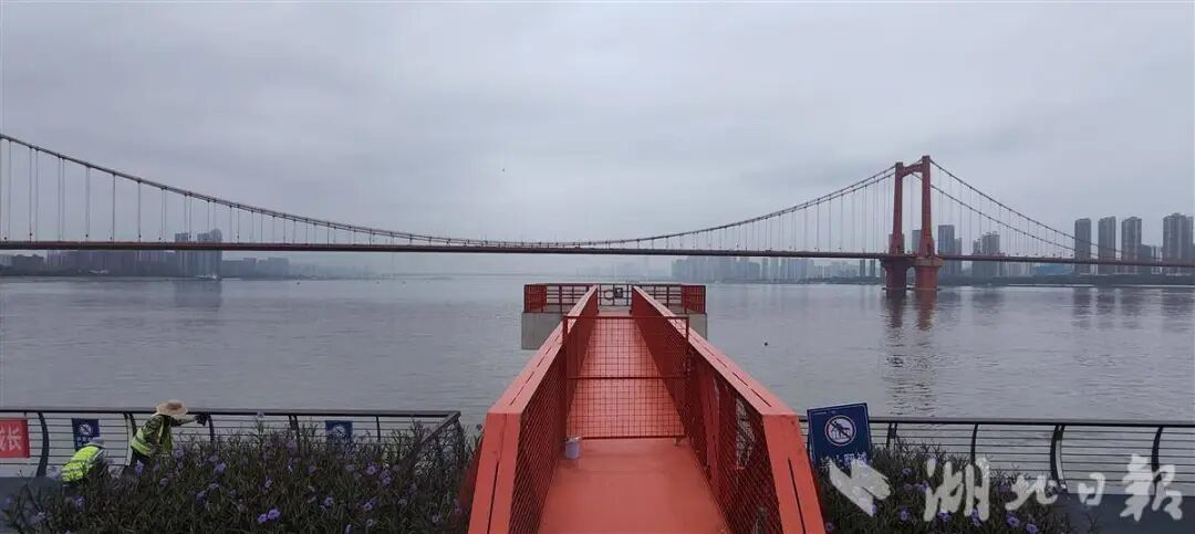 第六处打卡点则是另外一处大型塔吊平台,保留基座和连接岸边的栈桥,经过清洗、防锈、防腐处理后,涂上与鹦鹉洲大桥相同的橘红色,艺术化地融入整体景观中,已有网友称之为“网红栈桥”。武汉城建集团有关负责人表示,预计来此打卡拍照的人较多,为确保安全,将采取限流措施。