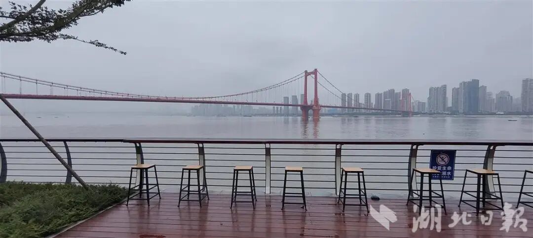 第八处打卡点,是精心设计的观江吧台。在这可以一边聊着家常,一边感受秋风,对面就是橘红色鹦鹉洲大桥的雄姿。