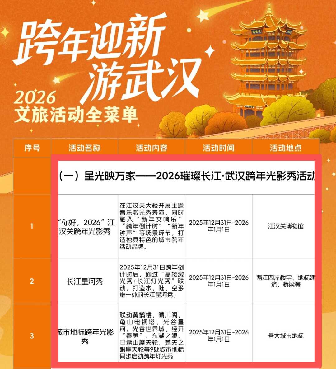 1.“你好,2026”江汉关跨年光影秀:在江汉关大楼开展主题音乐灯光表演,融入新年交响乐、跨年倒计时、新年钟声等环节。