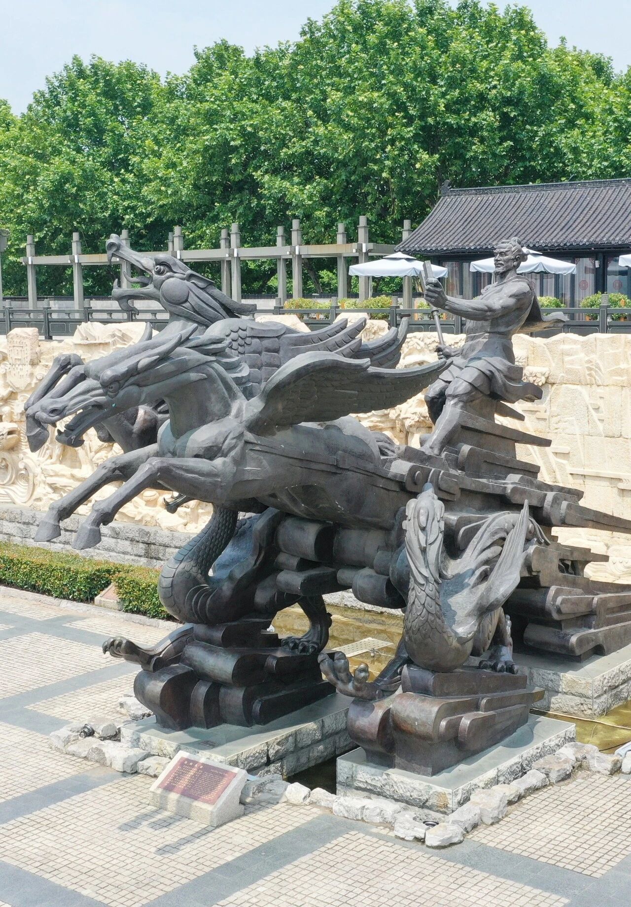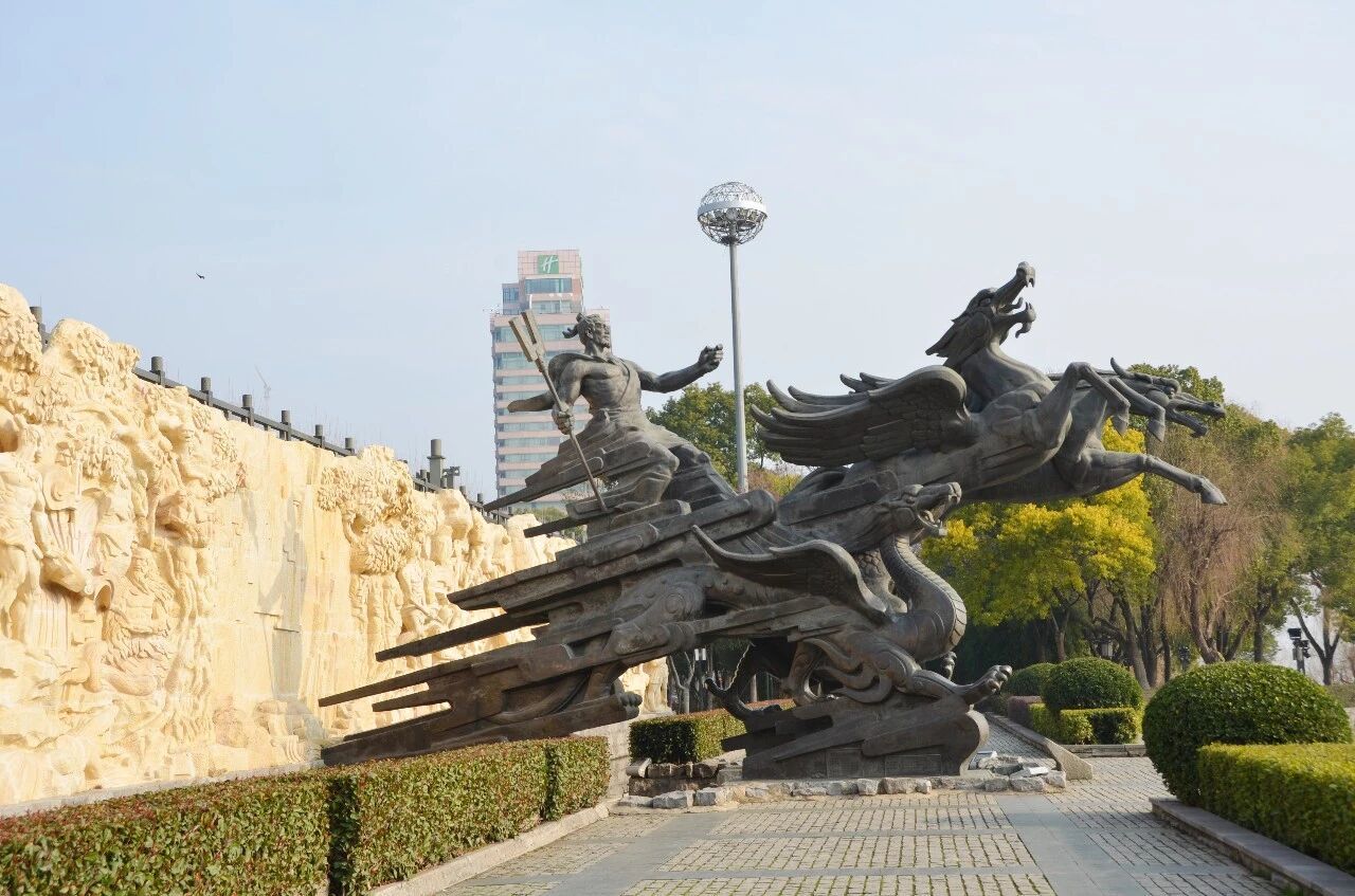 大禹神话园中的这座雕塑与此描述相符,龙头马身,昂首嘶鸣,四蹄生风,大禹立于其上,目光坚毅望向远方,眉宇间满是治水平患的决心。