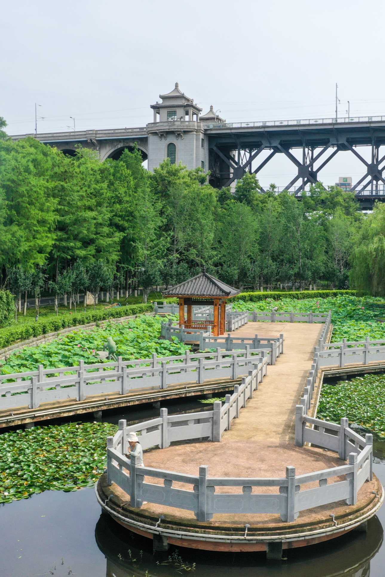 从莲花门进入汉阳江滩,不远处有一方池塘,名为“洗马池”。若是夏季前来,池中荷花亭亭玉立,清风拂过,绿波红香,别有一番雅趣。