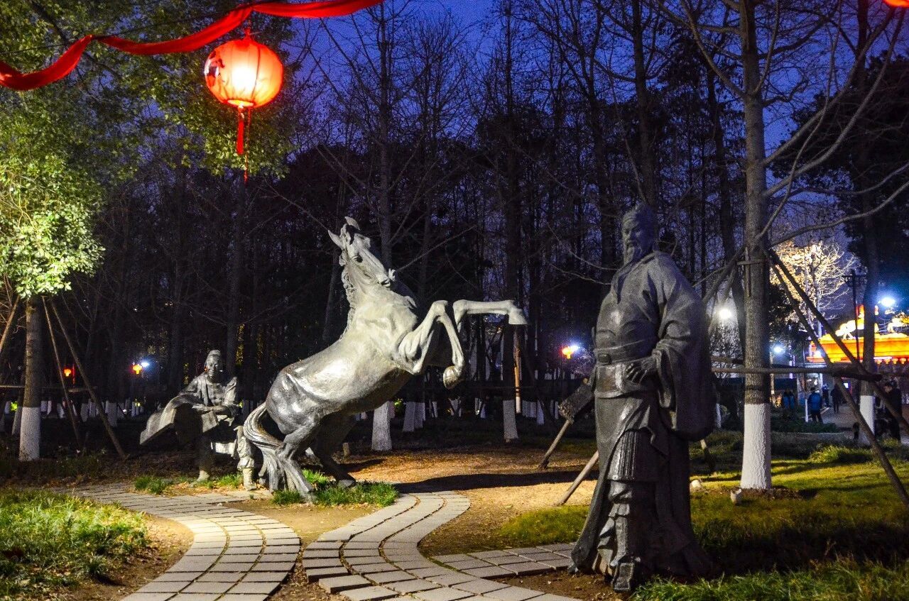 值得一提的是,正在汉阳江滩火热开展的晴川灯会中,有一组名为“一马晴川”的灯景就设立在“关羽洗马处”旁。