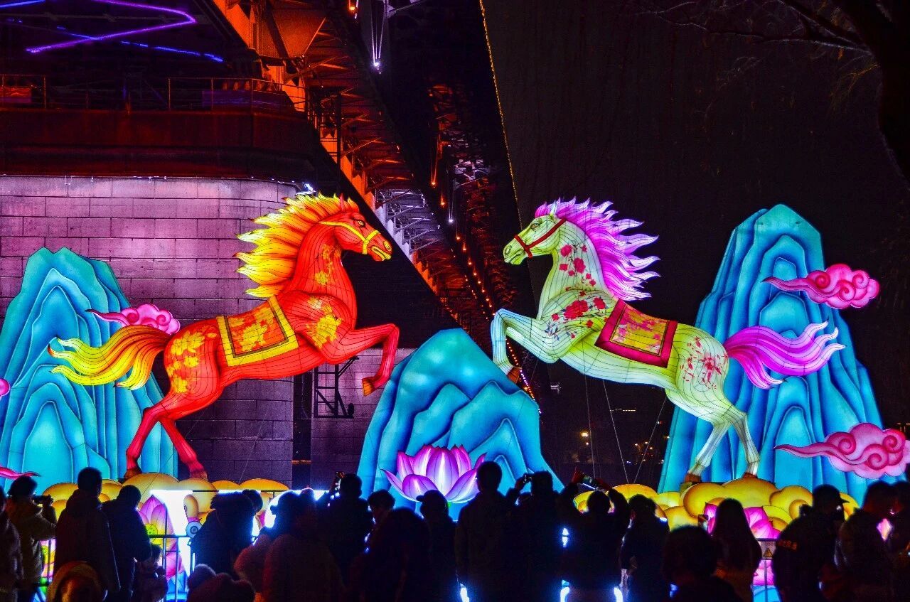 这组以骏马为主题的大型彩灯,在夜幕下流光溢彩,与古朴的铜雕相映成趣,形成一场跨越古今的对话。