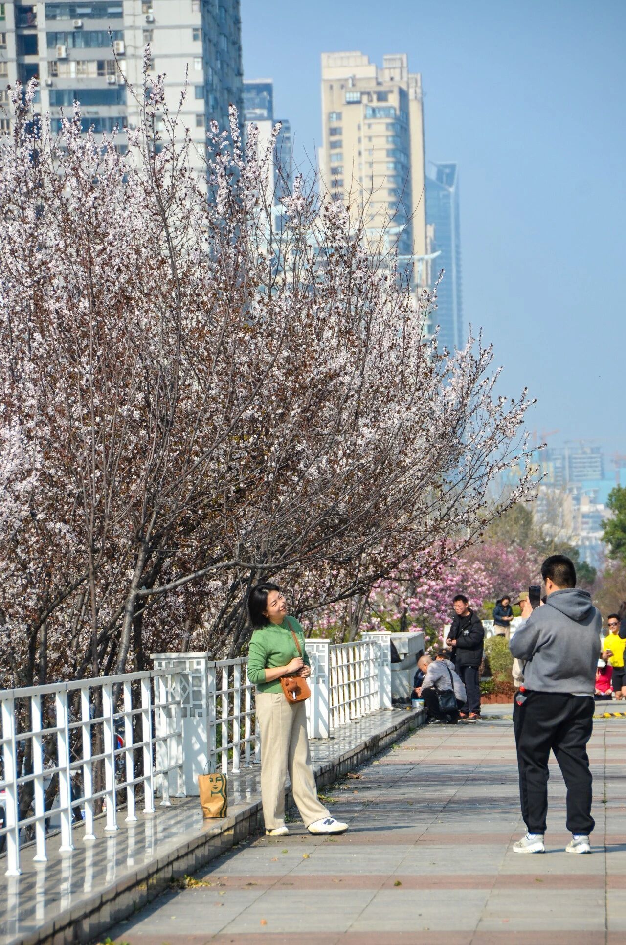 还可以从江滩向外俯拍,将城市道路、建筑一同入镜,车水马龙与满树繁花同框,出片自带电影般的故事感。